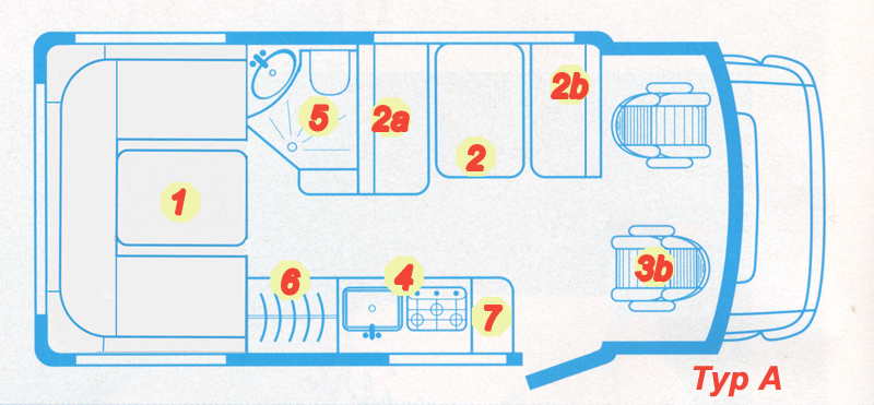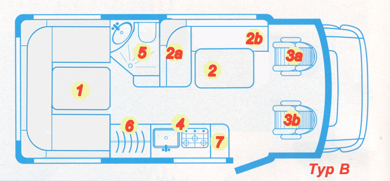 Beim Typ B ist die oben beschriebene Seitensitzgruppe in L-Anordnung verbaut. Richtig viel Platz bekommt man, wenn der Fahrersitz [3a] drehbar ist und mit in die Sitzgruppe einbezogen wird.