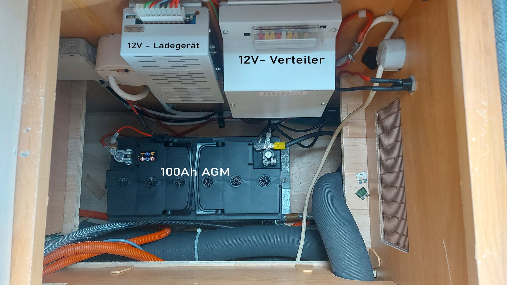 Damit kam ich zum nächsten Problem: Der Kühlschrank lief während der Fahrt nicht auf 12V. Das wunderte mich doch sehr, da sowohl die rote LED für die Ladung während der Fahrt im Bedienpanel leuchtete als auch die elektrische Trittstufe automatisch einfuhr. Also hieß es mit Messgerät und nicht vorhandenen Schaltplänen auf Fehlersuche zu gehen. Obwohl die Lösung sich ganz simpel anhört, war ich doch erstaunt: Die 40A Sicherung für die Starterbatterie im Motorraum war durch. Sicherung ersetzt und der Kühlschrank lief wieder auf 12V. … und die Spannungsanzeige der Starterbatterie funktionierte auch wieder. Somit waren alle anderen Aussagen zum Ladeverhalten der Starterbatterie im Bedienpanel etwas für den Po.. . Diese Erkenntnis war aber für die spätere Verschaltung des Ladeboosters noch sehr wichtig.