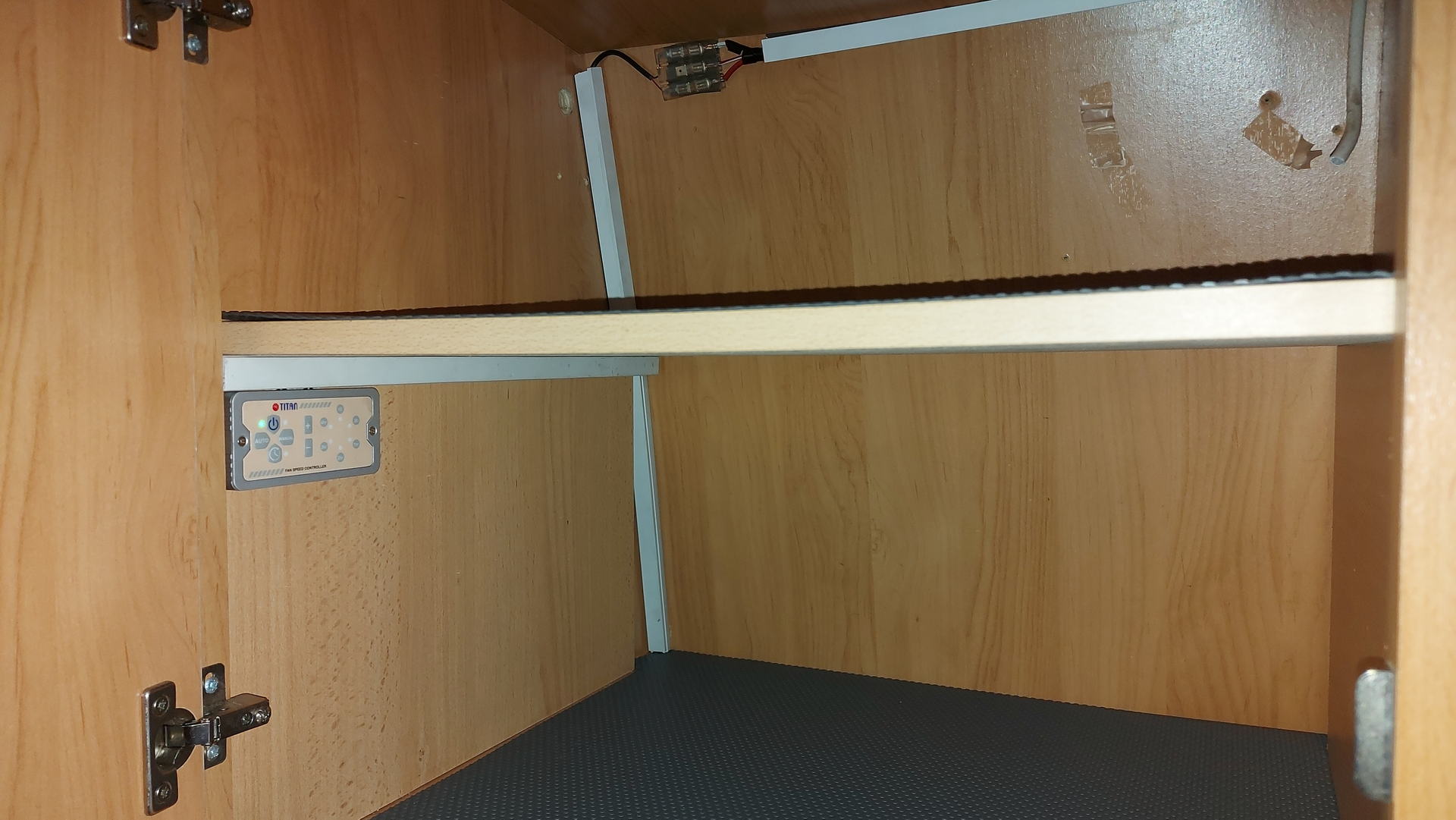 Auf dem Dach des Hobby war eine automatische SAT-Anlage installiert. Da wir aber nicht vorhatten, darüber Fern zu sehen, wurde die Anlage entfernt. Die Dachdurchführung sollte später für die Solaranlage genutzt werden. Den Spannungsabgang über dem Kühlschank nutze ich aber nun für einen Titan TTC- Kühlschrank-Doppellüfter mit ø 140 mm.
