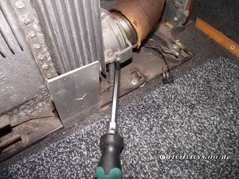 Zum Austausch des Brenners muss die Heizung komplett demontiert werden. Dazu wird zunächst die Gasflasche vom System getrennt. Unter dem Fahrzeug kann nun die Gasleitung an der Heizung abgeschraubt werden (SW17 - Rechtsgewinde). Anschließend Innen die Heizungsverkleidung abheben und den Drehstab herausziehen, die Kabel von der Zündbox abziehen, die Box beiseite legen. Nun noch die Klammer vom Abgasrohr lösen, das Rohr rausziehen und die 6 Schrauben aus dem Heizungsbodenblech herausdrehen. Nun lässt sich der Heizkörper nach oben herausheben.