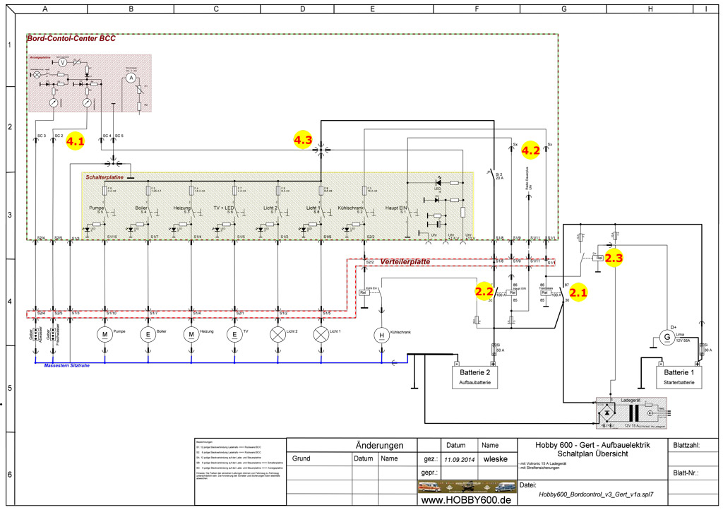 Zur Vorgeschichte: Bei dem Hobby 600 schalteten sich alle Verbraucher sporadisch aus. Durch Klopfen auf das BCC im Bereich der Schalterplatine ließen sie sich wieder zum Leben erwecken. Eine Überprüfung der Verbindungsstecker zeigte keine Auffälligkeiten, sodass von einem „Wackler“ auf der Lade- und Steuerplatine auszugehen war. Dazu kam auch noch, dass das Fahrzeug mit einer GEL- Batterie ausgerüstet wurde, die mit dem originalen Ladegerät eh nie vollgeladen werden konnte. So machte ich den Vorschlag, ein modernes Ladegerät einzubauen und die Elektrik so umzurüsten, dass sie ohne Lade- und Steuerplatine funktioniert.