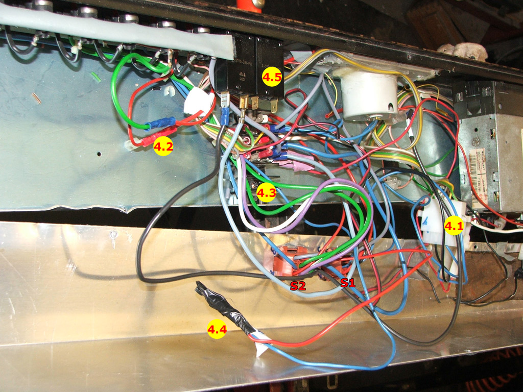 An zwei Stellen müssen Leitungen von S1 direkt mit der Schalterplatine durchverbinden werden (Bild 4.2). Eine Mehrfach-Klemmleiste übernimmt die Verteilung der verschiedenen Masse bzw. Pluspunkte (Bild 4.3). Nicht mehr benötigte Adern werden isoliert (Bild 4.4). Der 20A Sicherungsautomat für Batterie 1 ist auch nicht mehr in Funktion (Bild 4.5).