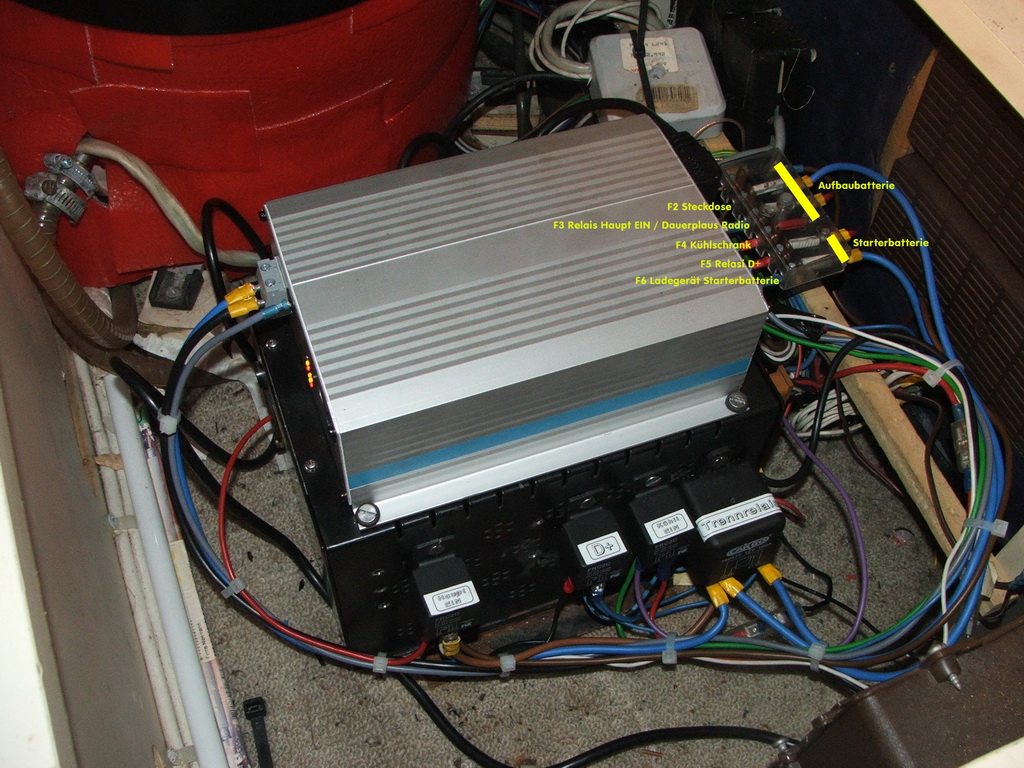 Die Verdrahtung der Relais erfolgt nach dem geänderten Schaltplan (Bild 3). Hierbei wird besonderen Wert auf eine Absicherung der einzelnen Leitungen von den Batterien gelegt. 30A Streifensicherungen direkt an den Batterien und ein 6er Sicherungsblock übernehmen diese Aufgabe.