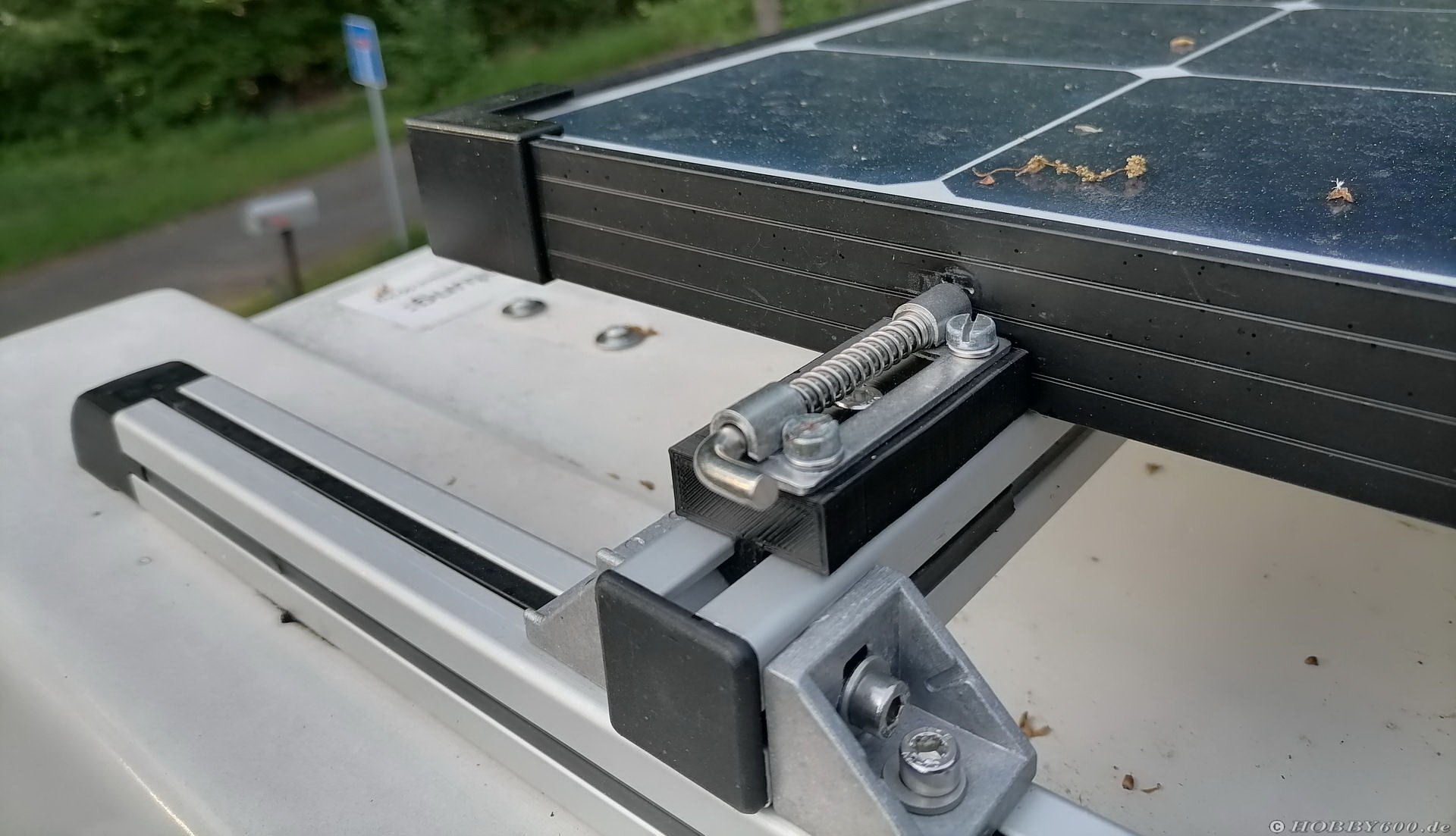 Bild 2: Befestigung und VerriegelungDafür habe ich die hintere Reling abgebaut und zwei Profile längst neu angebracht. Darauf sind zwei Profile quer montiert, die wiederum die Solarpaneel mit einer Klappvorrichtung aufnehmen. Warum Klappvorrrichtung? Damit ich den Einfallwinkel verändern und möglichst viel Sonne einfangen kann.