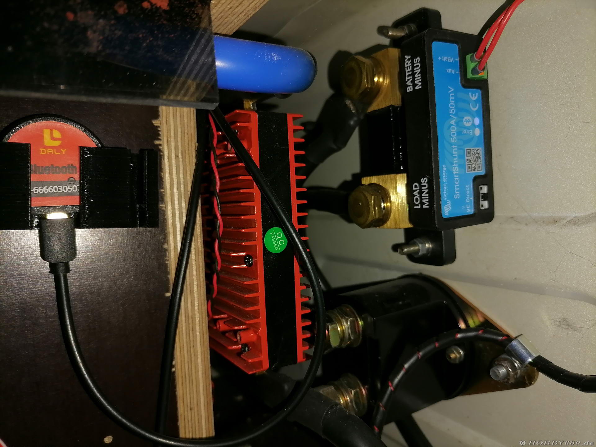 Bild 8: Shunt, BMS und ....Für den genaueren Überblick über den aktuell verbrauchter Strom und Ladezustand der Anlage zu haben, habe ich deshalb einen Victron SmartShunt eingebaut. Damit wird mein Handy zum Batteriecomputer. Über Bluetooth verbunden, kann ich damit die Spannungen von Aufbau- und Starterbatterie, den Verbrauch und die Restkapazität ablesen.