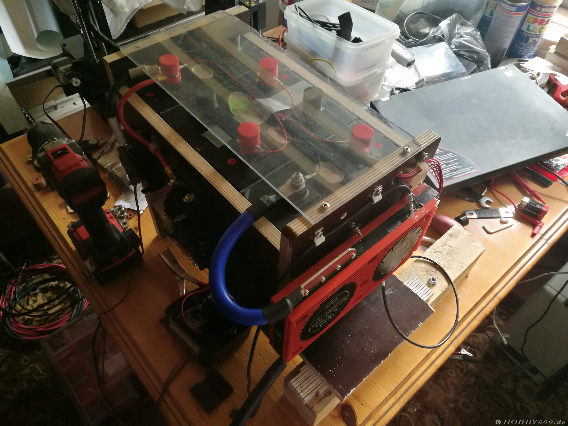 Bild 6: LiFePo- Akkkupack TestaufbauSo fiel die Entscheidung auf LiFePo-Zellen. Mit den 310 Ah LiFePo-Zellen stehen mir gut 240 Ah als nutzbare Kapazität zur Verfügung. Und das bei einem Gewicht von nur ca. 30 Kilo.