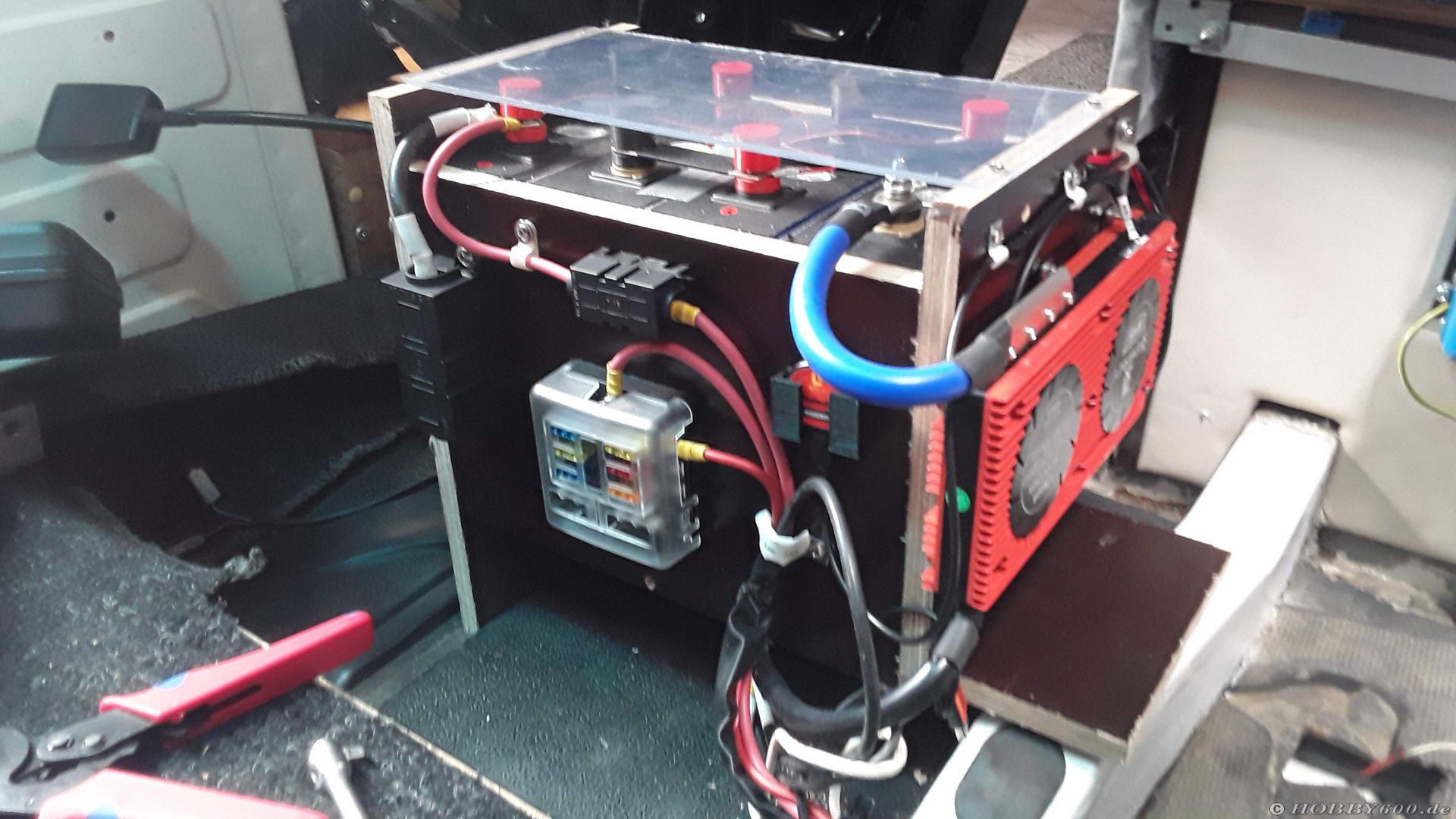 Bild 7: Akku-Pack unter FahrersitzDie LiFePo-Batterie wird nur über die Solarzellen geladen. Die Verbindung vom BCC zur Starterbatterie habe ich abgeklemmt. Die Lichtmaschine versorgt nur die Elektrik des Basisfahrzeugs und die Starterbatterie.
