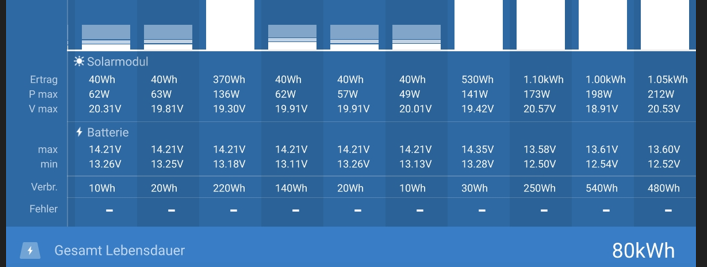 Bild 11: Anzeige VerlaufMit der 310Ah LiFePo4 Batterie und 2x 110W Solarpanel haben wir letztes Jahr und diesen Sommer keinen „Landstrom“ mehr gebraucht. Ein möglicher Tagesertrag von über 1 kWh sichert mir genug Energie. Auch wenn die Sonne mal nicht scheint, habe ich reichlich Reserve und wenn sie wieder scheint, wird der Batterie zum Teil mit einem Spitzenwert von bis zu 209 W schnell wieder aufgeladen.