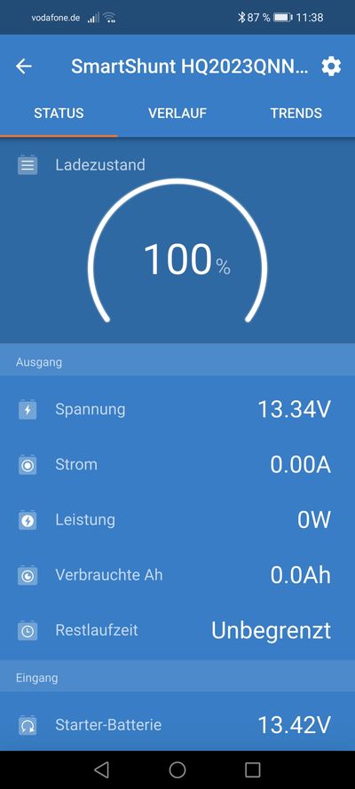 Bild 9: AnzeigeIm Wohnraum sind keine weiteren Knöpfe oder LCD-Anzeigen verbaut. Laderegler, DC-Wandler und Wechselrichter wurden hinter dem Fahrersitz verbaut. Solarregler, Ladegerät, BMS (LiFePo4 Batterie Management System) und Shunt können über Bluetooth mit Handy- Bzw. Laptop-Apps eingestellt und überwacht werden.