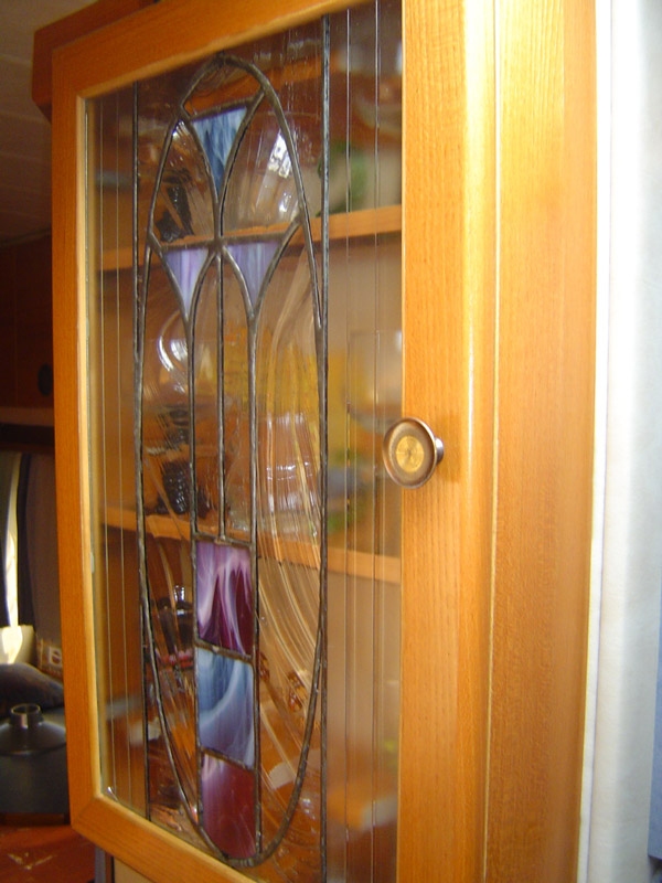 Natürlich sollte das Schränkchen nicht nur ein Schränkchen, sondern auch ein Schmuckstück werden. Da kam ein weiteres Hobby von mir, die Tiffany-Glastechnik, zum Einsatz. Schnell war ein Motiv entworfen und nur kurze Zeit später ein Glaseinsatz entstanden, der seit dem unserem Gläserschränkchen eine ganz persönliche Note verleiht.