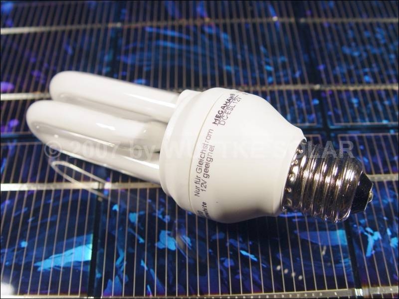 Der Clou an der ganzen Angelegenheit sind nun aber die verwendeten Glühlampen. Die Firma Wuttke-Solar bietet eine Energiesparlampe (DC ESL 12 V 11 WATT 12,00 €/Stück) für den Betrieb an 12V Gleichspannung an. Die Lichtausbeute ist vergleichbar mit einer Standard 60 Watt Glühlampe.