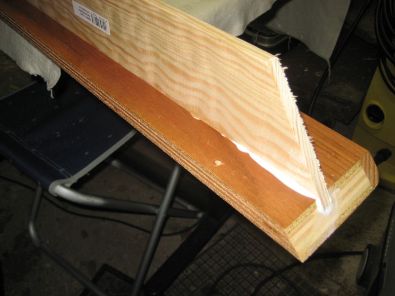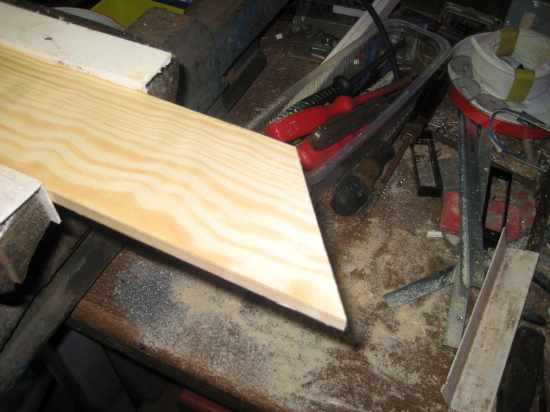 Zunächst habe ich die Gardinenleiste in ihre Einzelteile zerlegt (Bild links). Für den Regalboden habe ich eine Kiefernholzleiste 9 x 78 mm genommen. An einer Seite wird die Schräge angepasst (aus der abgesägten Ecke, wurde eine Abdeckung für den 12 Volt-Anschluss gebastelt). In die Abdeckleiste der Gardinenleiste wurde eine Nut von 9mm Breite und 6mm Tiefe, 30mm von der Oberkante entfernt eingefräst. BILD