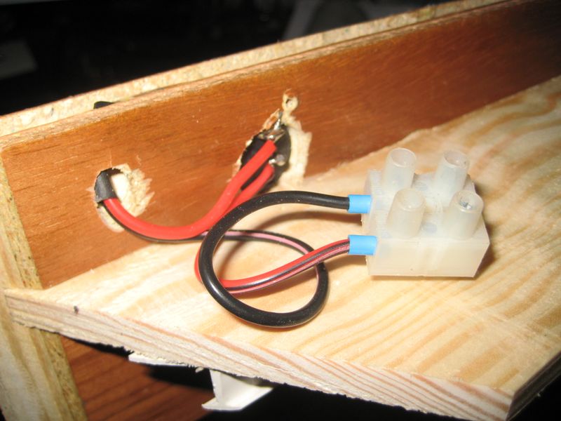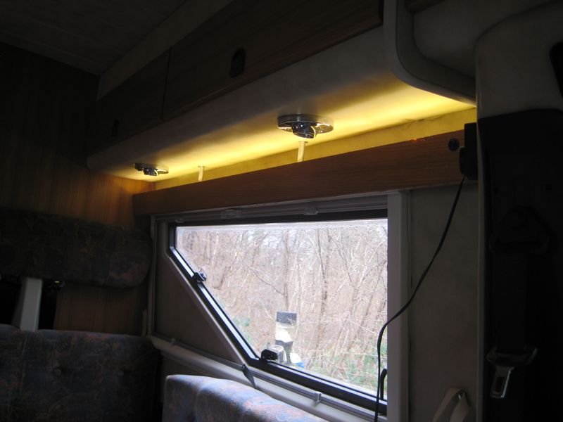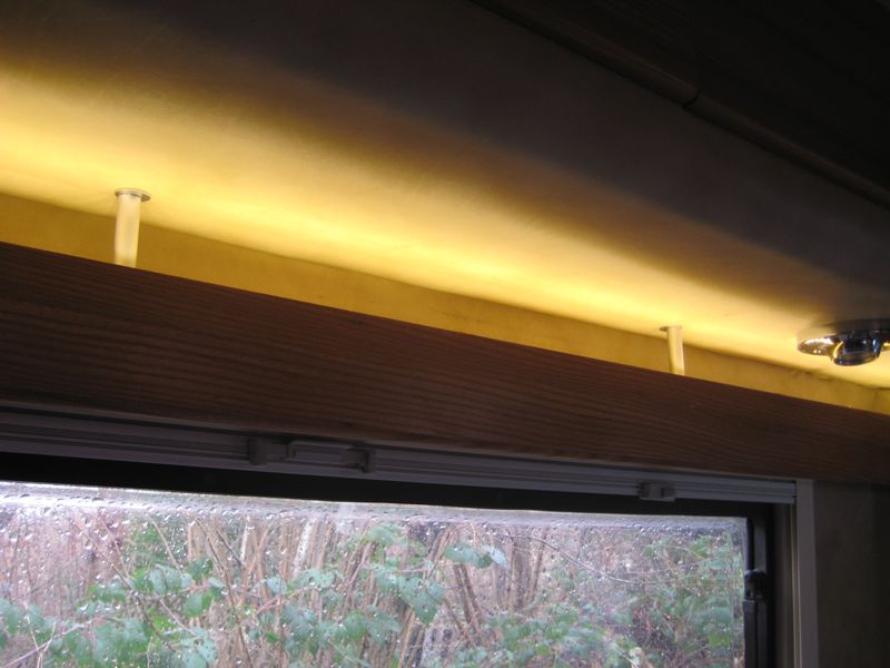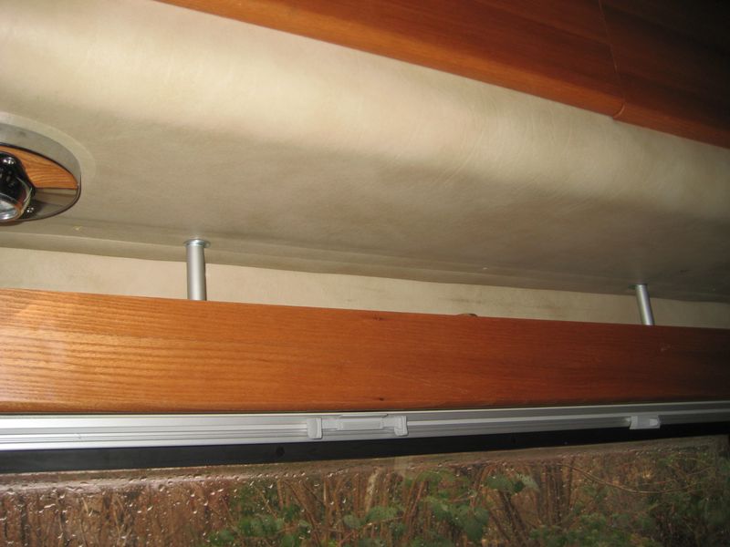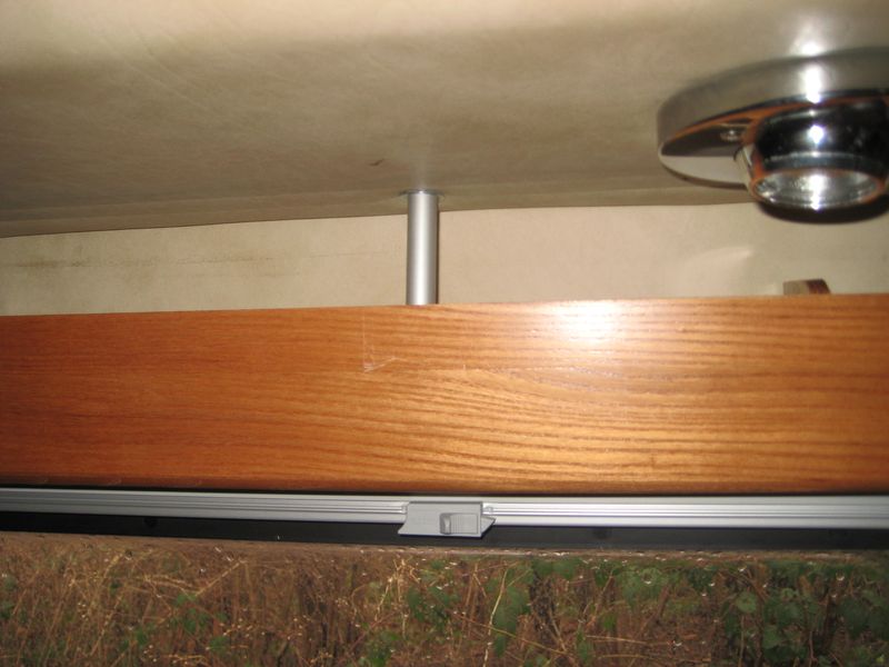 Befestigt wurde die neue Gardinenleiste links und rechts mit zwei Blechwinkeln (40x50mm). In der Mitte mit 2 Schlossschrauben M6 x 120 mm mit 85mm langen Abstandshaltern aus 15mm Alu-Rohr. 12Volt habe ich am Licht im Hängeschrank angeschlossen. Eine Abdeckung über den 12 Volt-Anschluss und Schalter habe ich aus der abgeschnittene Ecke und einem Stückchen Holz gebastelt.