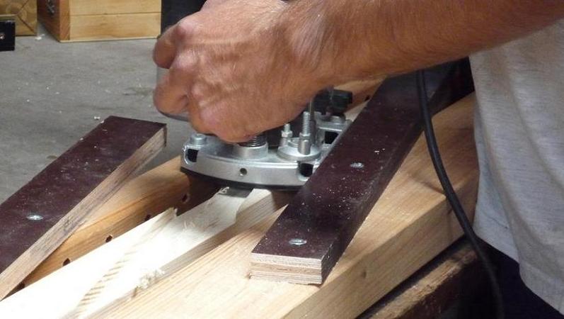 Und damit kommen wir nun zur Praxis. Das Holz: 8 Balken werden mit der Oberfräse bearbeitet. Wir haben zuerst eine Schablone gemacht, weil wir 8x das gleiche fräsen müssen. Die Winkel haben wir vorher mit AutoCAD ermittelt. Nach dem Fräsen müssen wir noch ein bisschen aussägen, weil die Kreuze sonst die höchste Position nicht erreichen können.