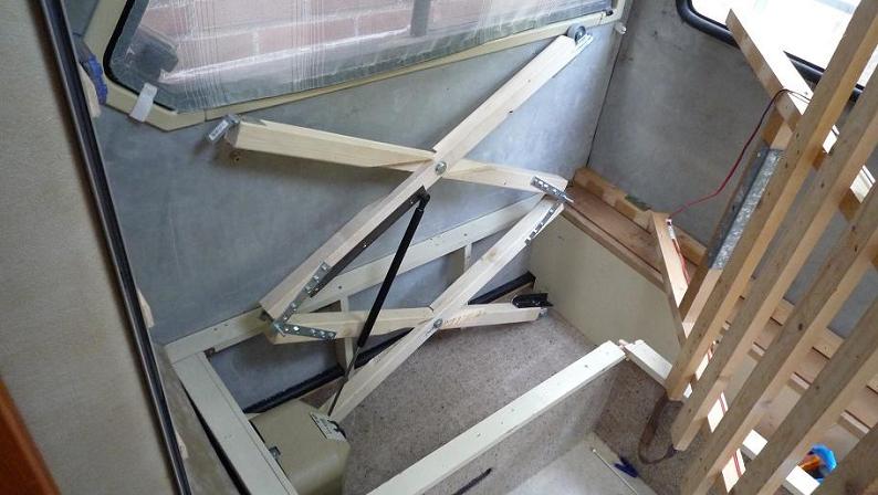 Im Wohnmobil haben wir das alte Bett komplett heraus genommen. Jede Scherenbühne ist an einer Seite (vorne) fest am Boden verschraubt. Die andere Seite (hinten) läuft oben und unten auf Rädern. Nach der Montage der Scherenbühnen werden diese zunächst mit einem Spanngurt gesichert. Der alte Lattenboden wird nun wieder zusammen geschraubt, und an den 2 Scherenbühnen vorne befestigt. Hinten läuft gemacht das Lattenrost ebenfalls auf Räder.
