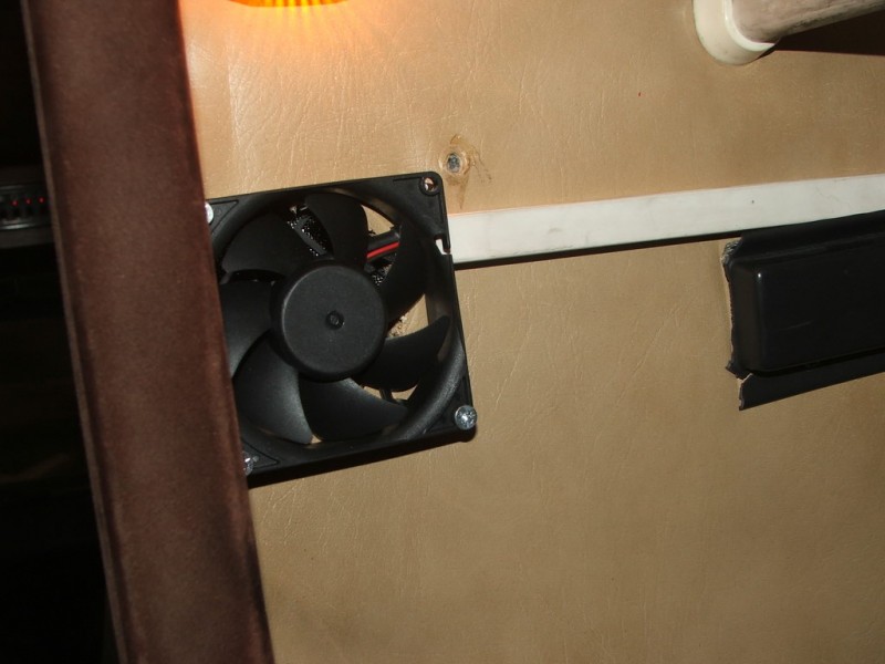 Da mich dieser Umstand schon lange genervt hat, nutze ich die Winterpause für eine Verbesserung. Mit Hilfe eines PC-Lüfter 80mm Durchmesser und passender Abdeckung blase ich die warme Luft nun durch eine Bohrung in der Schrankwand nach vorne in den Küchenbereich. Ich habe den Lüfter an die Klemmen 1 und 5 (Masse und gelb) des Trumavent-Gebläses angeschlossen. So spare ich mir einen zusätzlichen Schalter und nutze gleichzeitig die Drehzahregelung des Trumavent-Gebläses.