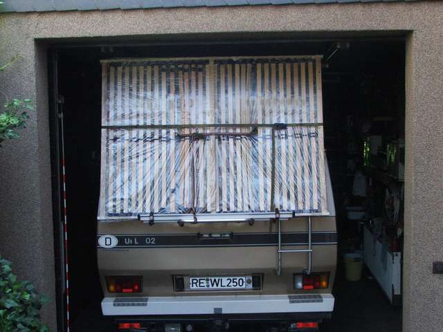 Moderne Dachhauben sind mit Sonnenrollos und Fliegengitter ausgerüstet. Bei unserem Fahrzeug fehlten sie natürlich noch. Es gibt in unserer Größe auch nichts im Campingzubehör. Um den kleinen Plagegeistern keine Gelegenheit zum Eintritt zu geben, habe ich die Dachhauben mit einem Rahmen aus dem Baumarkt nachgerüstet. Das Netz wird mit einem Gummi gespannt und kann einfach gereinigt oder ausgetauscht werden.