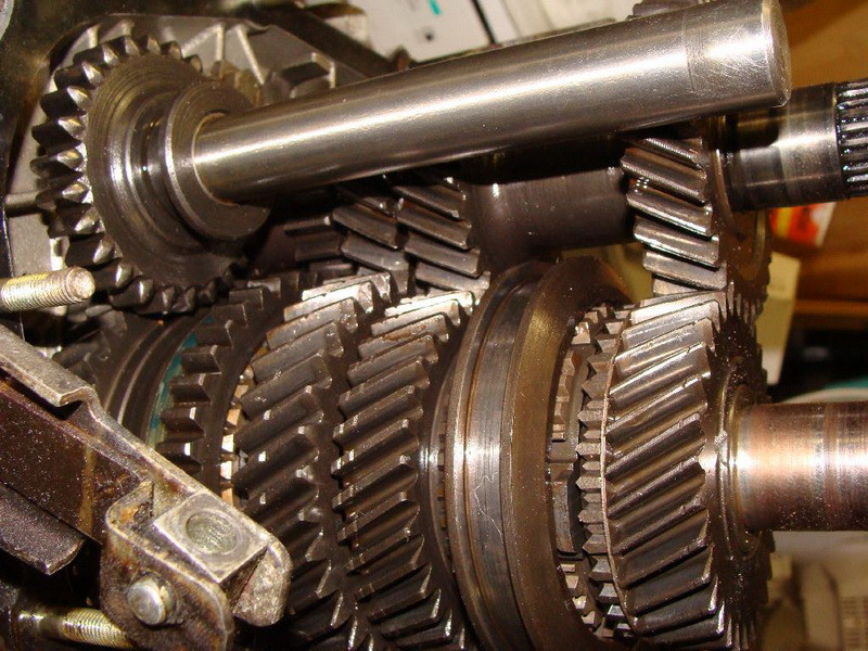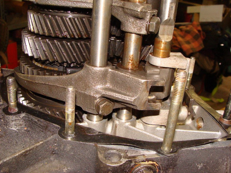 In umgekehrter Folge wird wieder zusammengesetzt. Zunächst der Dichtring der Eingangswelle, dann zwei der drei Stifte der Schaltstangenverriegelung, die werden mit Fett (= Verlier-sicherung) in die Kupplungsglocke eingesetzt. Die beiden Wellen werden eingesetzt und die 2 Schaltklauen Gänge 1 – 4 in die Muffen gelegt. Danach können die Schaltstangen eingesetzt werden. Sie werden durch die Klauen geschoben. Die mittlere Schaltstange bekommt den dritten (dünnen) Verriegelungstift. Auch die Montage der Arretierung des Rückwärtsgangs funktioniert so einfach. Nutsteine für den Schalthebel nicht vergessen. Nun kann das Gehäuse wieder auf die Glocke gesetzt werden. Dann werden die Lager eingesetzt und die Stahlplatte wieder aufgelegt. Deren Schrauben habe ich mit Schraubensicherung mittelfest gesichert. Danach folgt die Montage des 5ten Gangs. Zum Anziehen der Muttern können der Rückwärtsgang und mit der noch nicht fixierten Schaltmuffe der 5te Gang zugleich eingelegt werden (aufpassen, dass die Kugeln des Synchronkörpers nicht fliegen gehen).