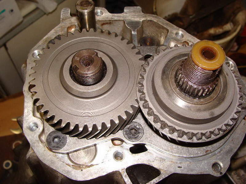 Daneben ist eine kleine Stahlplatte mit 2 Schrauben befestigt, hinter der sich Federn und Stahlkugeln zur Arretierung der Schaltstangen befinden. Muss ab. Dann kann man die Schaltklaue des fünften Gangs lösen und diesen nur mit der Muffe einschalten (Muffe nicht zu weit bewegen sonst fliegen die Kugeln des Synchronkörpers), den Rückwärtsgang anschließend auch einschalten, dann sind die Wellen blockiert und man kann die Muttern der Gangräder Gang fünf lösen. Keinesfalls den Rückwärtsgang vor dem Lösen der Schaltklaue betätigen, dann fliegen die Kugeln des Synchronkörpers auch. Ohne Deckel lässt sich die Schaltstange zu weit bewegen…Wenn die Räder ab sind, folgt eine Platte welche die Lager hält. Die muss ebenso ab. Die Schrauben sind gesichert. Bei den Senkschrauben half nur Köpfe abbohren, Rest aufbohren, Torxbit einschlagen und damit ausdrehen. Das Lager der Eingangswelle zeigte Pittingspuren, musste also neu. Die anderen Lager sind zumindest gefühlt ok, hineinsehen konnte ich nicht. Danach kann das Getriebegehäuse von der Kupplungsglocke gelöst werden. Die Wellen und die Schaltstangen