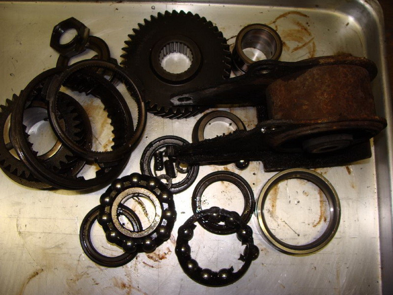 Neuteile waren Gang 5 mit Schaltmuffe, Synchronring Gang 2, rechtes Lager Eingangswelle, Dichtringe für Eingang und Abtrieb, 2 Sicherungsmuttern Gang 5, hinterer Lagerbock Getriebe - Rahmen (Zahnriemen und Rollen für den Motor hatte ich auch noch kommen lassen). Die Dichtung zur Kupplungsglocke war noch Ok, die Dichtung des kleinen Deckels schnitt ich aus Dichtpapier selber, die 3 zerbohrten Senkschrauben gab es noch im Fundus als Ersatz.
