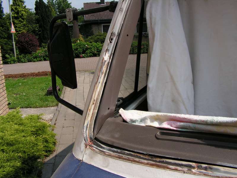 Außerdem wurde der Scheibenrahmen der Windschutzscheibe überarbeitet. Bei dem Rahmen war es übrigens auch wieder höchste Zeit. Obwohl man von Außen nichts gesehen hat, hat Dirk 5 Stunden schweißen müssen. Hier muss man wohl auch alle paar Jahre mal die Scheibe rausnehmen.