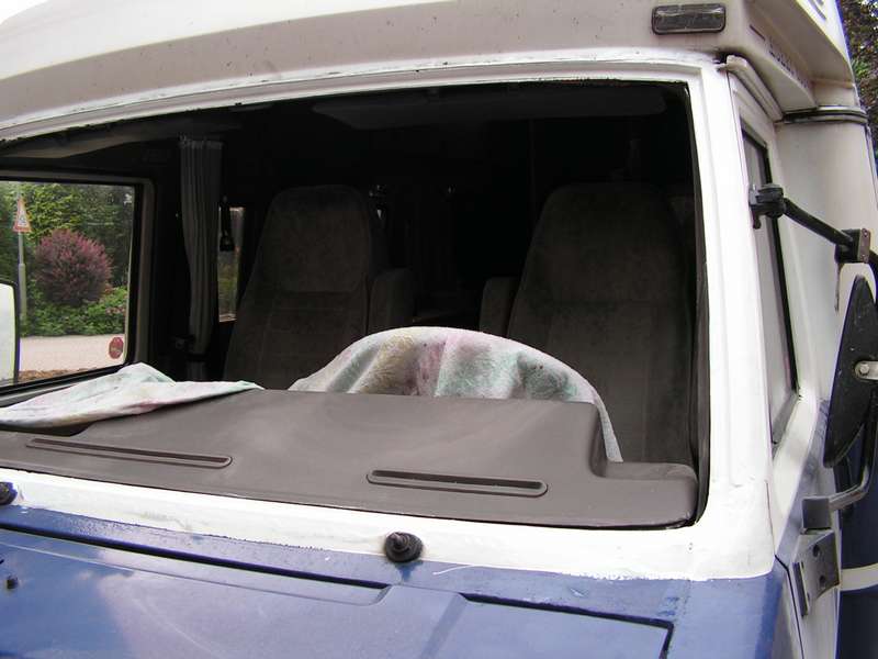 Die Frontscheibe hat Dirk mit den Füssen herausgedrückt. Mit einer zweiten Person, die Stück für Stück die Dichtung etwas von außen nachzieht, ging das eigentlich ganz gut. Auf jeden Fall ist auch für den Einbau eine zweite Person erforderlich.