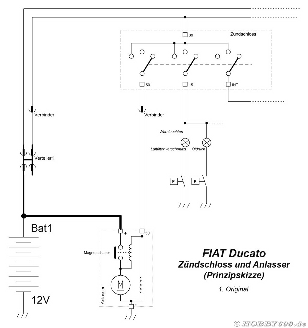 Dazu zunächst etwas Theorie. Ich habe die betroffenen Teile aus dem Schaltplan des Ducato mal in Bild 2 zusammengefasst. Im Wesentlichen sind für den Startvorgang drei Bauteile zuständig: die Batterie, das Zündschloss und der Anlasser. Zwischen diesen Bauteilen liegt die Verdrahtung mit den entsprechenden Klemmen, Verteilern und Steckverbindungen.