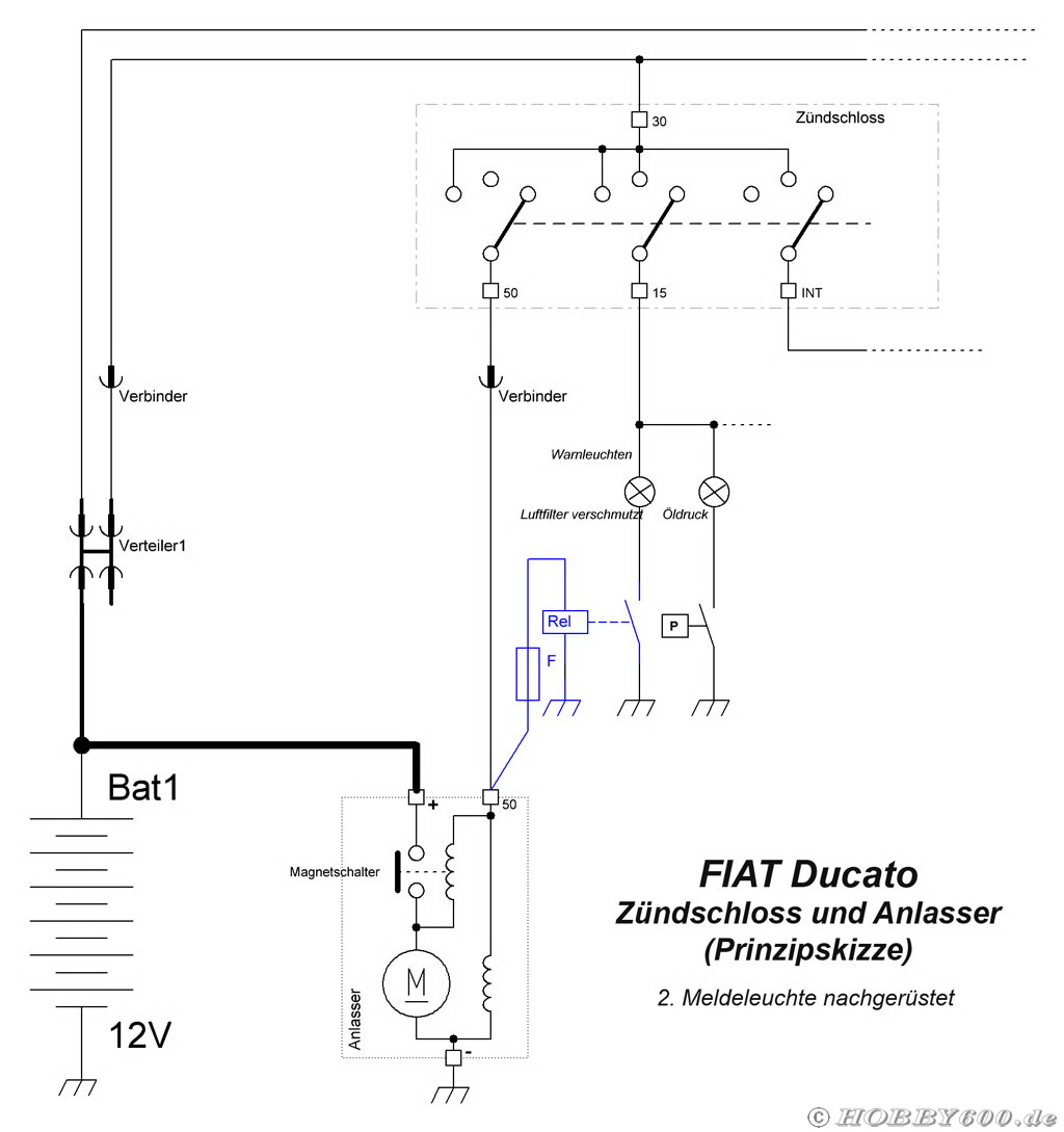 Ich vermutete also irgendwo einen zeitweisen Übergangswiderstand, der manchmal nicht mehr ausreicht um mein Testrelais zum Anziehen zu bringen. Betrachtet man die Kontakte des Zündschloss, so sieht man von außen nichts. Sie befinden sich in einem Kunststoffgehäuse. Theoretisch kann der Kunststoff ausdünsten und die Kontakte belegen oder die Luft zwischen den Kontakten wird ionisiert, was ich bei den geringen Spannungen eher für unwahrscheinlich halte. Aber je mehr ich darüber nach dachte, desto unsinniger erschien mir die Originalverdrahtung von FIAT. Warum geht man mit dem vollen Magnetschalter-Strom über das Zündschloss? Jeden Scheinwerfer schaltet man doch über ein Relais … und über Sicherungen. Also wurde die Verdrahtung gemäß Bild 8 geändert und ein Relais zwischen gebaut.