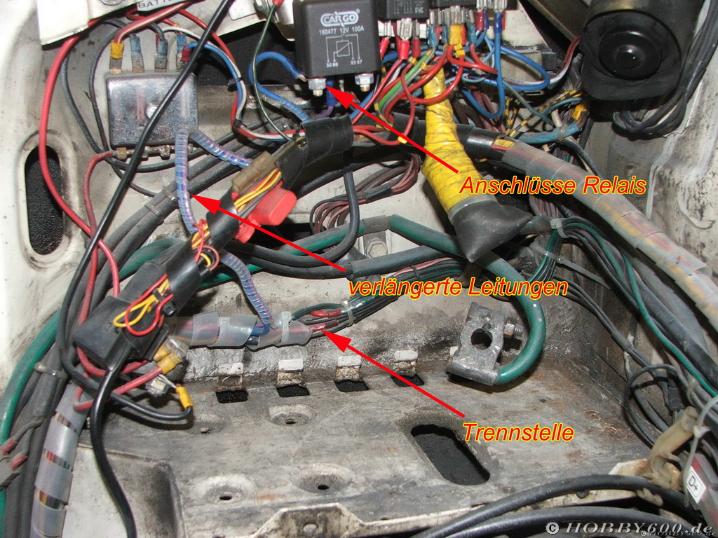 Dazu habe ich zunächst die Batterie im Motorraum ausgebaut, da sich dahinter der Kabelbaum vom Armaturenbrett zum Anlasser befindet. Die rote Leitung vom Zündschloss zum Magnetschalter war schnell gefunden und durchtrennt. Die beiden Leitungsenden habe ich dann bis oberhalb der Batterie verlängert. (Bild 9) Für die Verlängerung habe ich Stossverbinder mit Schrumpfschlauch verwendet. Dabei werden die abisolierten Leitungen in den passenden Quetschverbindertyp eingeführt, mit einer handelsüblichen Crimpzange gecrimpt, und anschließend mit einem Heißluftgebläse so lange erwärmt, bis der Kleber an den Enden austritt. Die Verbindung ist 100 % wasserdicht. Danach konnte die Batterie wieder eingebaut werden. Oberhalb der Batterie habe ich dann das neue Relais für den Anlasser montiert. An dieser Stelle befinden sich bei unserem Hobby 600 bereits mehrere zusätzliche Relais für Hupe, Trittstufe usw. Für den Anlasser habe ich allerdings ein Relais mit einer größeren Leistung gewählt und eine Streifensicherung in die Zuleitung von der Batterie eingebaut.