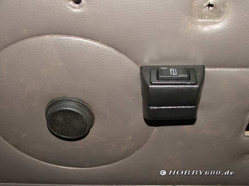 Nun müssen an den Türverkleidungen an geeigneter Stelle Ausschnitte für die Schalter eingebracht werden. Mit Hilfe der beiliegenden Schablonen werden die Öffnungen angezeichnet und dann mit einer Stichsäge ausgeschnitten. Bei dieser Gelegenheit muss die Bohrung für die Original- Fensterkurbel erweitert werden. Die Abdeckung für die Kurbel ist etwas größer, weil hier gleichzeitig die Notbetätigung angesetzt werden kann.