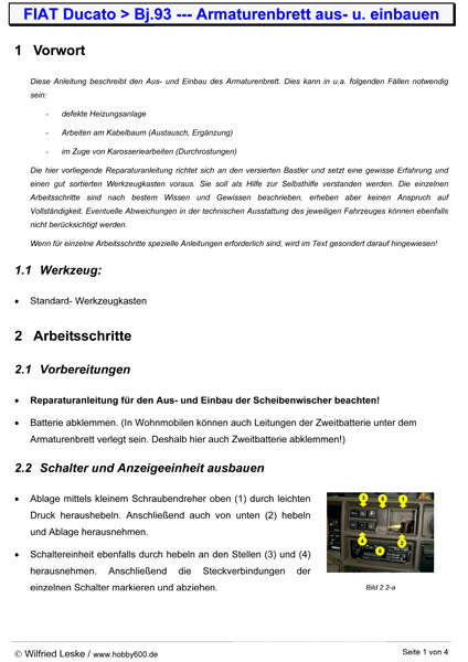 Bei den älteren Ducato- Fahrzeugen ist das Heizungsgebläse noch Bestandteil der Heizung. Bei einem Defekt (Lagerschaden bzw. Geräusche) muss die Heizung zerlegt werden. Hierzu ist aber vorher die komplette Armaturenbrettverkleidung zu entfernen (siehe separate Anleitung). In dieser Anleitung ist der Ausbau der Heizung beschrieben.