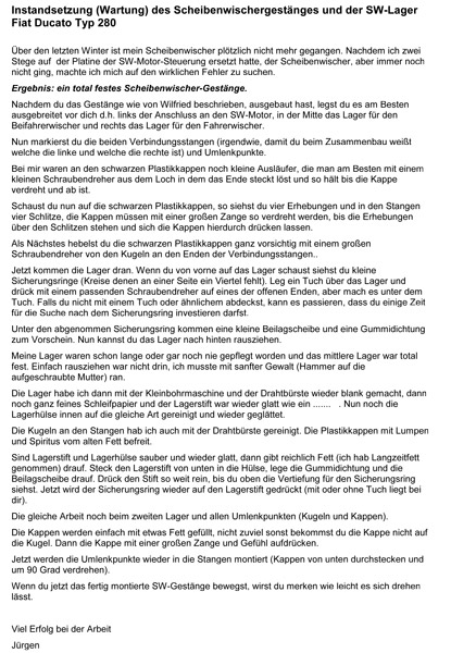 Jürgen aus München hatte an seinem Fahrzeug die Wischerlager fest. Er hat mir freundlicherweise eine Beschreibung seiner Reparatur zur Veröffentlichung auf meiner Website zur Verfügung gestellt! Hierin beschreibt er die erforderlichen Arbeiten zur Reparatur der Wischerlager.
