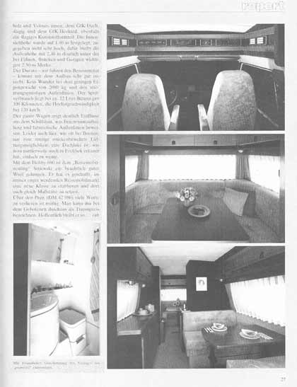 Bei dem mit Velours ausgeschlagene Innenraum wird, wegen der sich schnell blank werdenden Ecken, auf die Möglichkeit der Sonderausstattung mit Skai verwiesen. Das von Cramer (leider?) nur für den Hobby 600 gebaute Controlboard über dem Fahrerhaus wird in dem Beitrag mit „faszinierend" beschrieben.