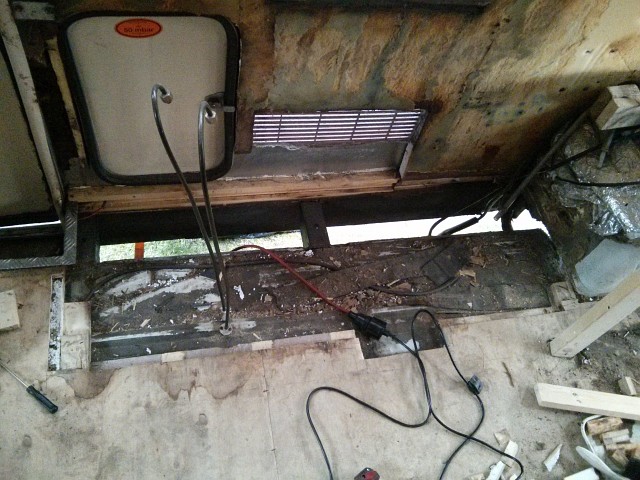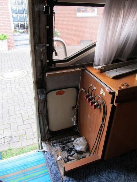 Nachdem ich das äußerlich schon sichtbar angegriffene Seitenbrett der Küche (neben der Eingangstür) demontiert hatte, zeigte sich, dass die Wand in diesem Bereich durchgefault war. Die Ursache dafür war nach meiner Einschätzung wohl der nachträglich montierte Einstiegsbügel, zumal dieser bereits einmal versetzt wurde es dadurch nicht nur 4 Löcher, sondern 8 in der Wand waren. Die 4 alten wurden aber nicht fachmännisch abgedichtet, leider. Der Schaden doch schon etwas größer war. So stand schnell fest, dass ein Teil des Küchenblocks ebenfalls erneuert werden muss.