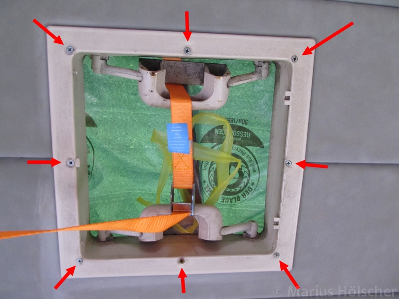 Zuerst einmal muss die alte Dachhaube ausgebaut werden. Dazu muss man am inneren Rahmen die Kappen von den insg. 8 Schrauben entfernen und kann diese anschließend herausschrauben. Der Innenrahmen sollte dann abzunehmen sein.