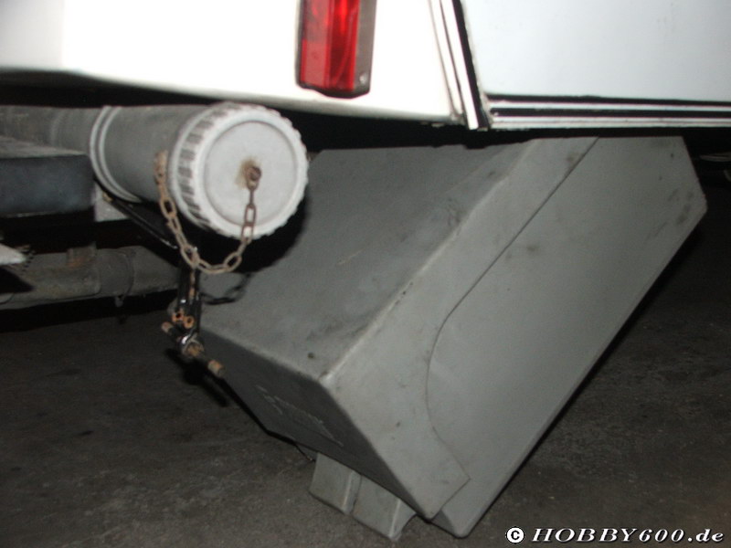 Aber zum Glück gibt es den Zubehörhandel. Dort bietet Fiamma die PORTA KASSETT passend für die C200 an. Die Reservekassette wird von einer stabilen Kunststoffbox geschützt unter dem Fahrzeugboden befestigt. Für die Montage unter dem Hobby 600 habe ich die Scharniere in der Höhe versetzt. So wird die Kassette am hinteren Querträger der Heckverlängerung befestigt. Die Original- Verriegelung sagte mir auch nicht zu, da sie zu tief nach unten herausragte. Hier bastelte ich mir aus eine Schnappkonstruktion und befestigte sie am hinteren Holm der Anhängerkupplung. Als kleiner Nebeneffekt ist diese Verriegelung nun auch noch abschließbar.