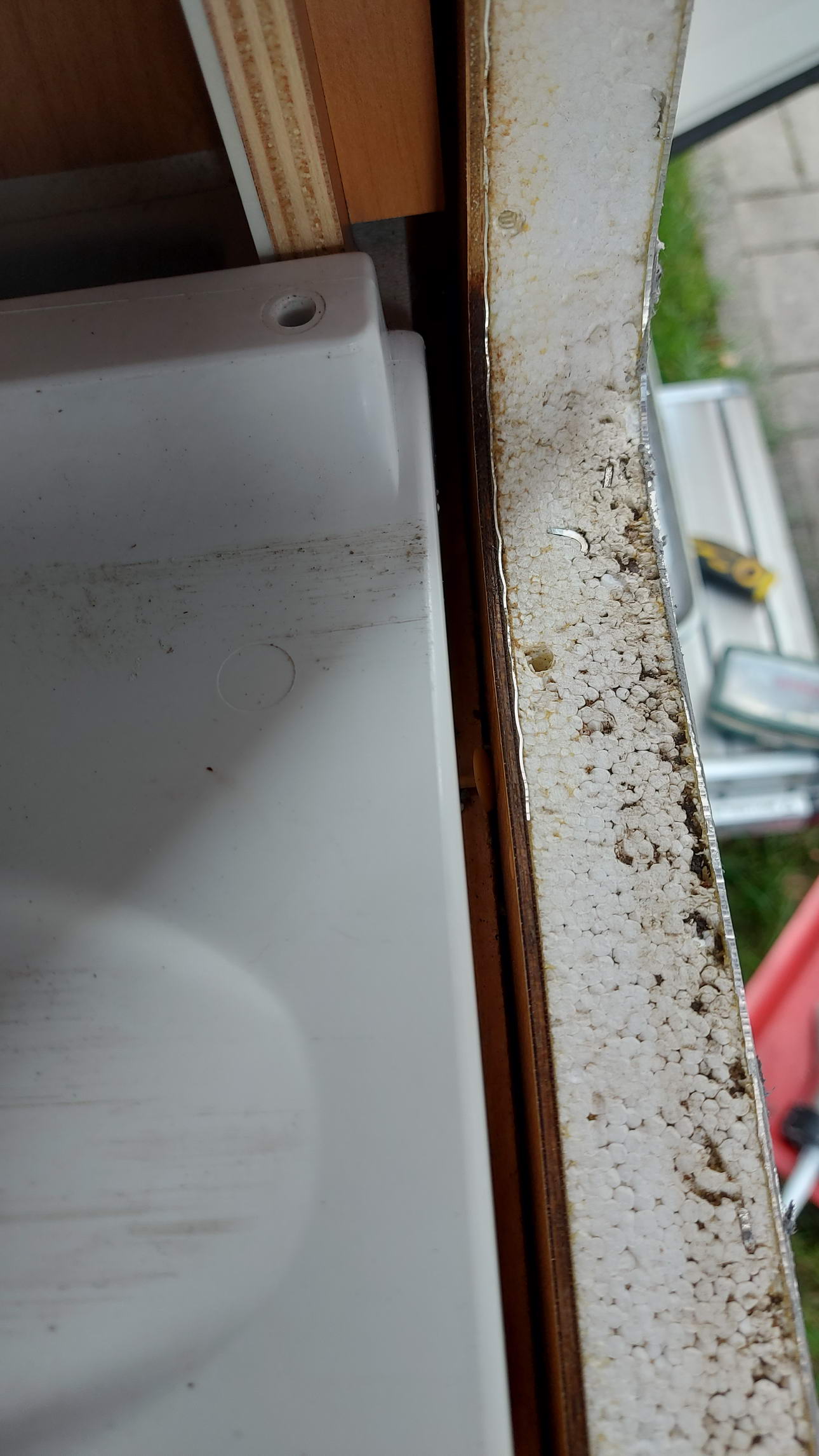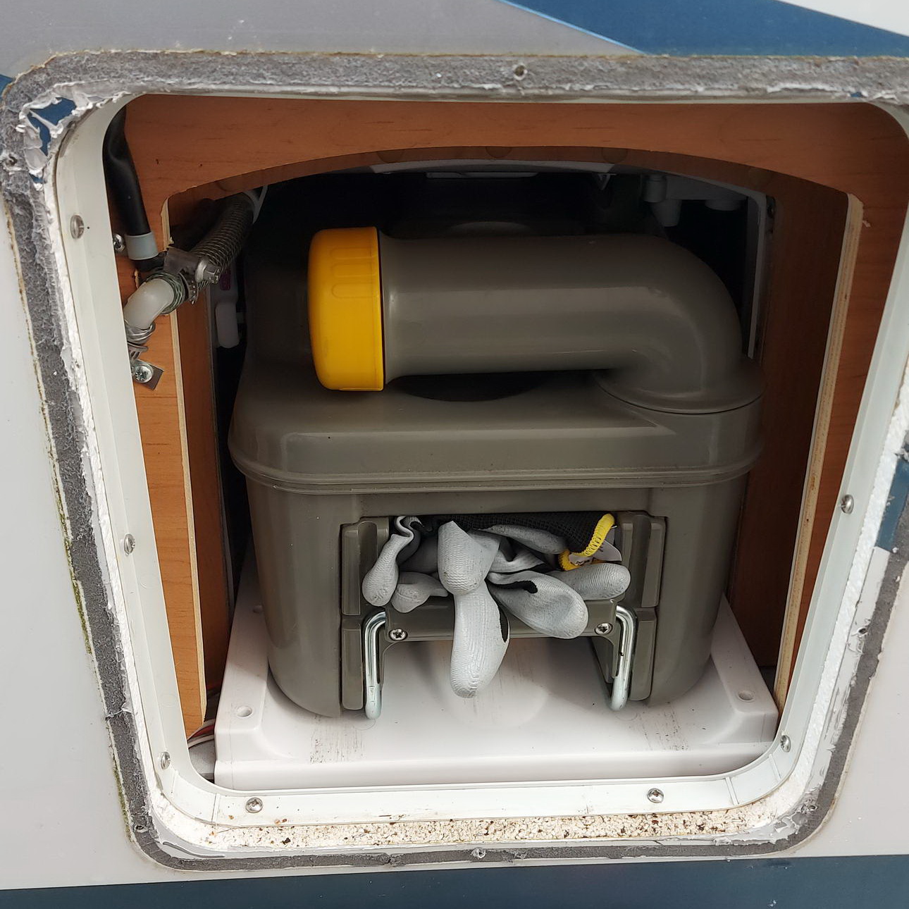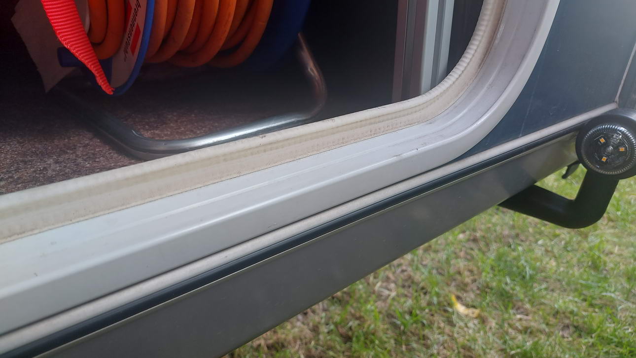 Allerdings war bei unserem Fahrzeug zwischen dem Rahmen der Serviceklappe und dem Gehäuse der Toilette ein Spalt von ca. 8 mm breite. Dazu kommt, das die Toilette etwas höher als der Fußboden sitzt. Um es vorweg zu nehmen: nach 18 Jahren war die Türdichtung der Serviceklappe nicht mehr dicht und bei der Fahrzeugwäsche drang Wasser ein, dass dann durch den besagten Spalt zwischen Rahmen und Toilette auf den Fußboden floss und sich dann dort verteilte. Zum Glück haben wir es sofort gesehen und konnten den Boden relativ schnell trocken legen.