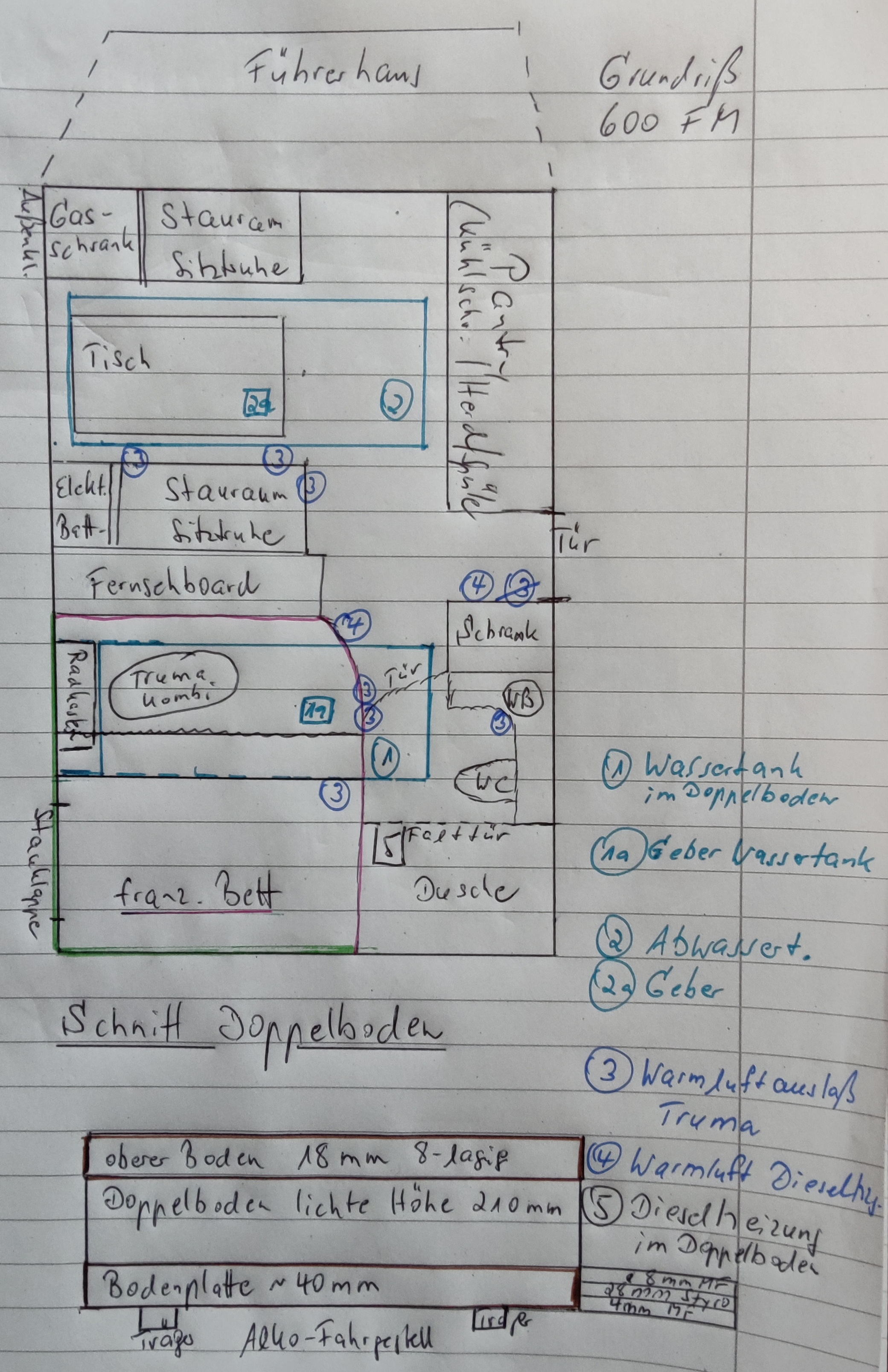 Da letzten Herbst keine Reise anstand, habe ich die Idee nochmals hervorgeholt. Ich suchte eine Lösung im Doppelboden im Heck mit separatem Tank, da ich mich mit dem Anschluss am Fahrzeugtank nicht auseinandersetzen wollte. Aus den verfügbaren Zeichnungen im Hobbyarchiv wusste ich, dass der Doppelboden eine lichte Höhe von 210 mm hat. Mit dem erforderlichen Luftraum nach oben, sollte dies für eine kompakte 2 KW Heizung ausreichen.