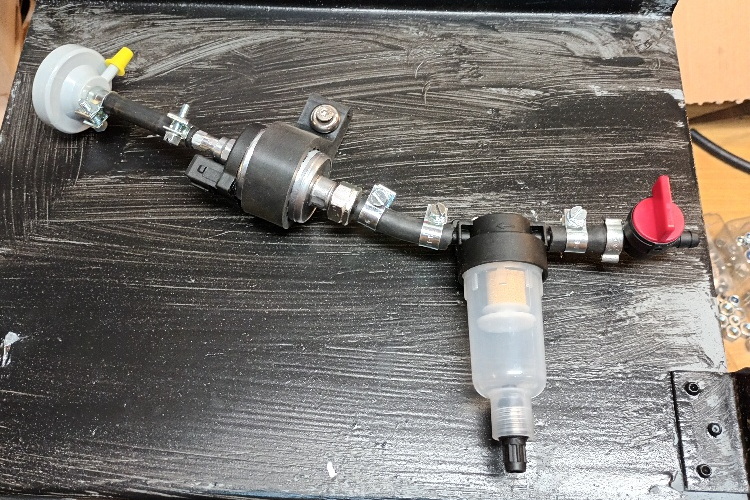 Hierbei wurde ich darauf aufmerksam, dass der Filter Richtung Ausgang mit Gefälle montiert werden soll, damit sich im Restkraftstoff am Ausgang befindet. Die Pumpe dagegen soll mit Steigung in Richtung der Heizung montiert sein. Dieses Problem habe ich mit einer Art „V“ Montage gelöst und den Filter direkt vor die Pumpe gesetzt. Inzwischen hat das System ca. 5 Probeläufe zu je 1 Std. erfolgreich absolviert.