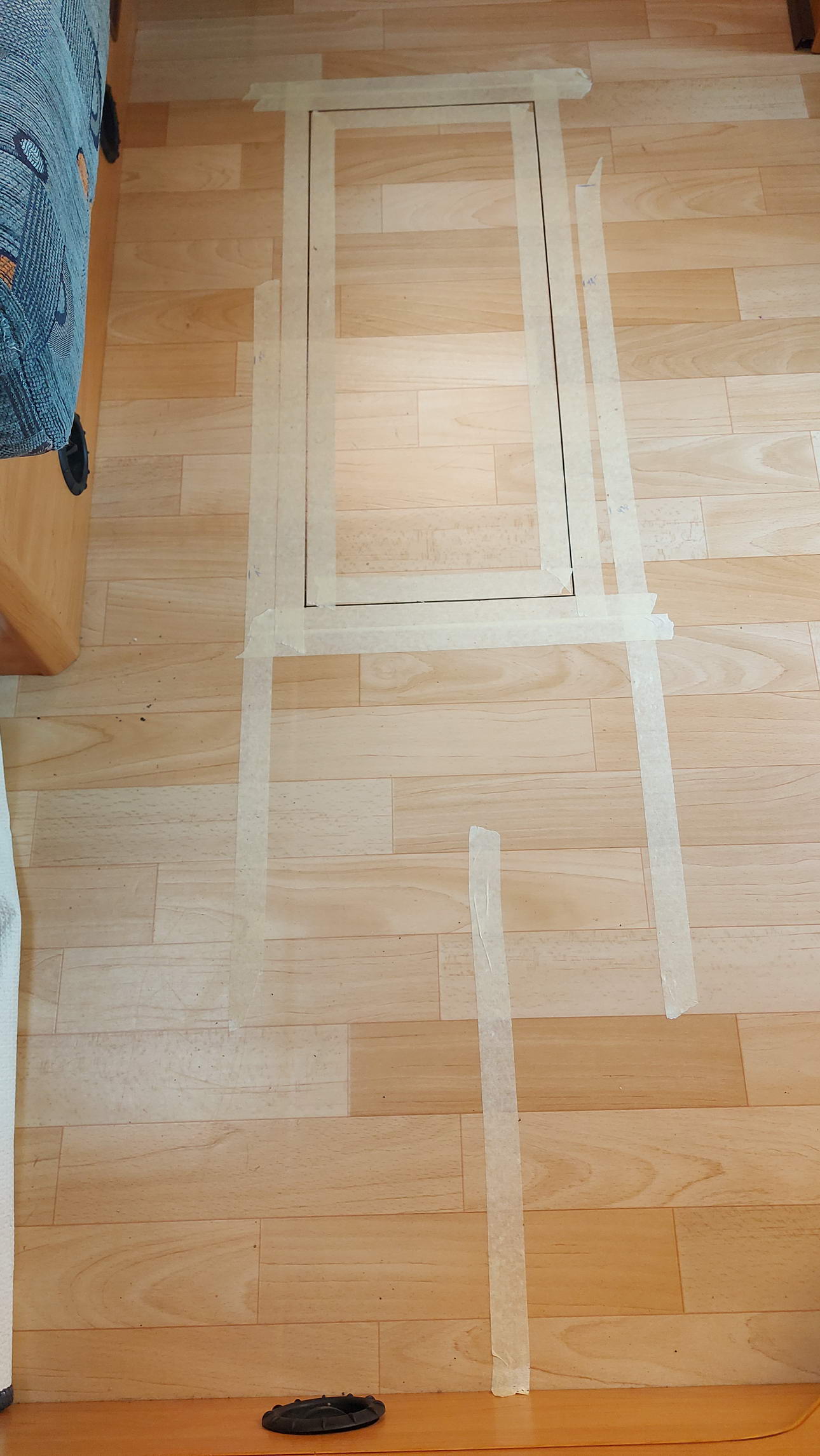 Bild 7Nachdem die Warmluftschläuche der Truma verlängert und anders verlegt waren, konnte ich die Schablone der Heizung anlegen und mittig ein Loch durch den unteren Fahrzeugboden bohren (Bild 7). So wurde der genaue Platz unter dem Fahrzeug nochmals kontrolliert. Da alles passte, konnte der Ausschnitt für den Einbaurahmen mit einer Sticksäge erstellt werden. Bevor der Einbaurahmen verschraubt bzw. verklebt wurde, habe ich die Heizung mal provisorisch eingebaut, um unter dem Fahrzeug die Positionen für die Dosierpumpe und die Abgasführung festzulegen.