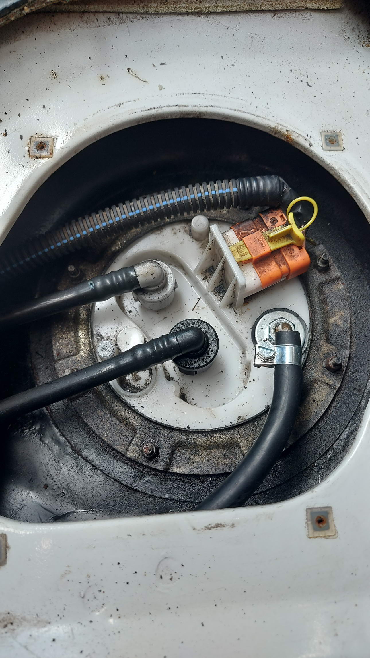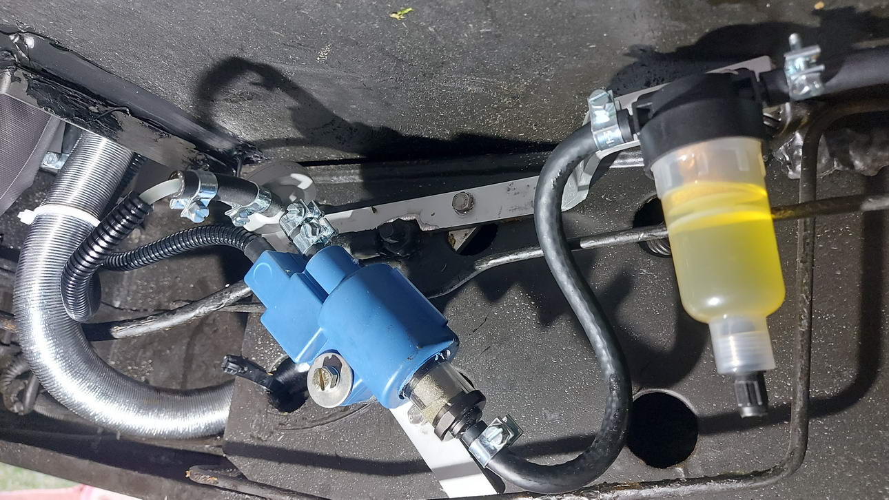 Bild 8Die Dieselversorgung der Heizung sollte diesmal aus dem Fahrzeugtank erfolgen. Dazu habe ich einen Tankentnehmer in die Kraftstofffördereinheit eingebaut. Diese sitzt unter einer Abdeckung zwischen den Sitzen im Führerhaus des Ducato. Als ich diesen Deckel entfernt hatte, sah ich das erste Problem: Der im Komplettset mitgeliefert Tankentnehmer war zu groß für den Einbauraum. Also musste ich mir einen Tankentnehmer mit kleinerem Kopf bestellen.