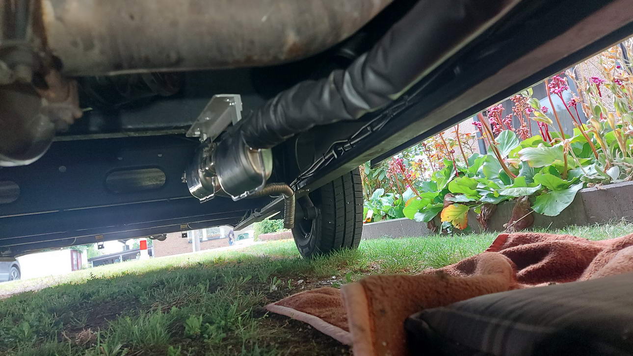Bild 13Nachdem die Heizung eingesetzt und verschraubt war, erstellte ich zunächst die Anschlüsse unter dem Fahrzeug. Den Frischluftschlauch mit dem Ansaugfilter legte ich ebenfalls in den Verbindungsflansch des AL-KO-Rahmen. So ist er vor Spritzwasser geschützt. Zum Schutz der Kraftstoffleitung habe ich das Abgasrohr mit einem Hitzeschutzschlauch versehen. Es wird zunächst nach hinten geführt. Unter dem Querträger für den Gurtbock konnte ich mit einer Halterung die beiden Abgasschalldämpfer befestigen. Von dort führt der Abgasschlauch durch eine Öffnung im AL-KO-Rahmen auf die Seite und dann nach unten. Fertig (Bild 13)