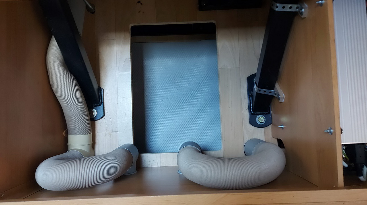 Nachdem die zu verbauenden Komponenten feststanden, ging es darum, den Einbauplatz für die Heizung zu finden. In den Staukästen war kein Platz, unter den Beifahrersitz oder in die Garage wollte ich nicht. Dafür wurde ich im Doppelboden fündig. Unter dem Tisch gab es einen Bereich, in dem nur die Heizungsschläuche der Truma lagen. Leider war dieser Raum aber nicht zugänglich. Also wurden alle Möglichkeiten ausgemessen: Kann man die Heizungsschläuche anders verlegen? Ist unter dem Fahrzeug an dieser Stelle ausreichend Platz? Ist genügend Platz für die zusätzlichen Warmluftschläuche der Dieselheizung? Da alle diese Fragen mit einem „Ja“ beantwortet werden konnten, stand der Einbauort fest: Im Doppelboden unter dem Tisch der Sitzgruppe.