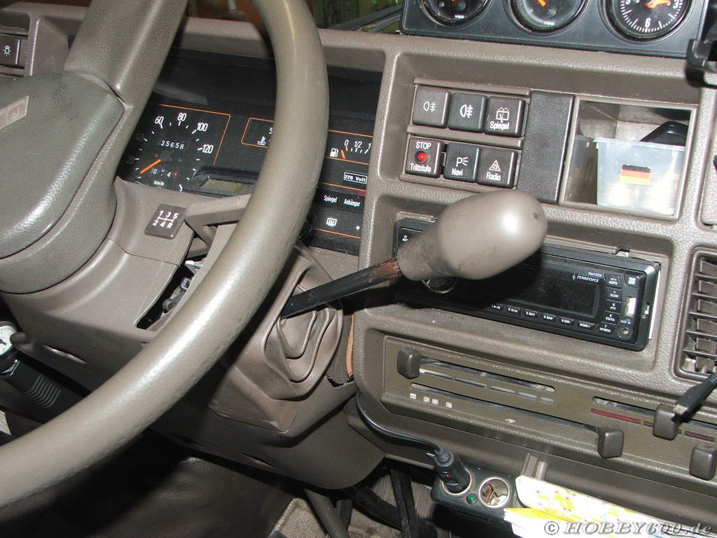 Die Anzeigeeinheit habe ich mit doppelseitigem Klebeband auf der Kunststoffverkleidung des Lenkstockschalters befestigt. Ein unterlegter Kunststoffkeil dient der Verbesserung der Lesbarkeit. Die Leitung der Spannungsversorgung ist unter der Schalthebelmanschette zu einer 12V- Steckdose verlegt. Die Steckdose hatte ich früher schon mal unter dem Armaturenbrett installiert. Sie hat nur bei eingeschalteter Zündung Spannung.