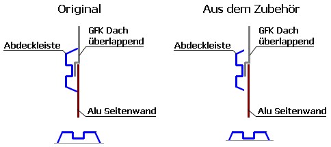 Was sich beim montieren als etwas problematisch herausgestellt hat (ich hatte dies bereits anhand der Bilder im Internet befürchtet) ist die Tatsache, dass die Abdeckleisten, die man im Zubehör Handel bekommt nicht genau die gleiche Form haben, wie die originalen. Dies macht sich bei überlappendem Dach bemerkbar. Ich habe mal eine kleine Skizze dazu angefertigt, die das verdeutlicht: