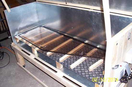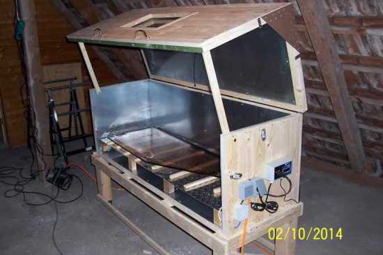 Ich habe mir einen Temperofen aus Holz gebaut und mit Blech verkleidet, der das große Seitenfenster aufnehmen kann und auf ca. 80 Grad erwärmt werden kann. :daumen2: