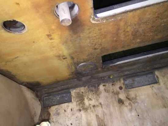 Was ich vorher schon wusste ist, dass die Dachluken mal undicht waren. Sie wurden einmal abgedichtet, teilweise erneuert und es war keinerlei Feuchtigkeit zu messen. Im hinteren rechten Hochschrank ist die Skaiverkleidung an der Decke etwas lose, was auf einen vergangenen Wassereintritt schließen lässt. Aber, wie gesagt alles trocken.