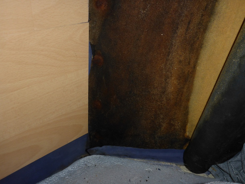 Ein Blick vom Boden nach oben zeigt, das der Unterboden im Bereich des runden Pfosten durchgefault ist, das ist der helle Berich wo ich von Hand die lose Oberfläche entfernt habe, blieb mir reglecht in der Hand liegen.