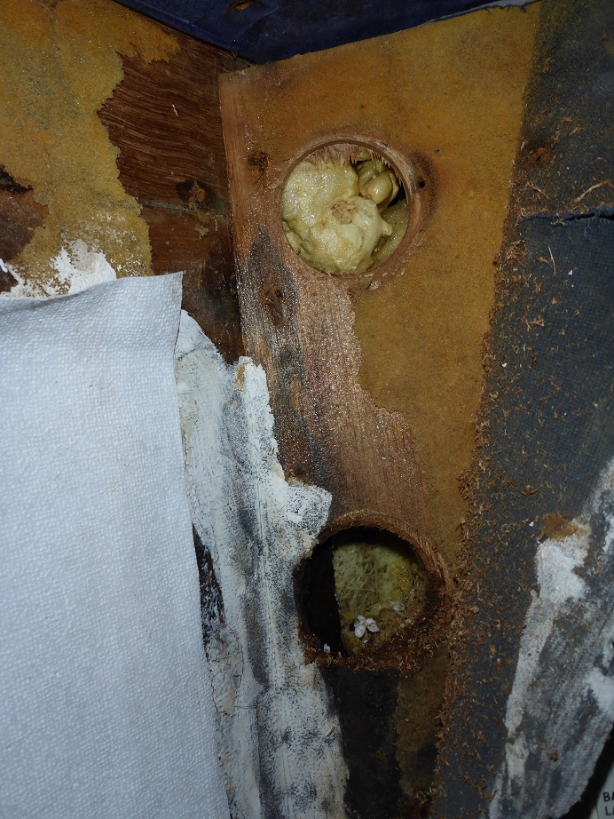 Am der senkrechten Leist habe ich nach oben das Styropor entfernt um mit dem Endoskop einen Weg nach oben zu finden. Hier gab es viel braunen PU-Schaum, könnte von einer Reparatur Neuverklebung des Daches stammen.