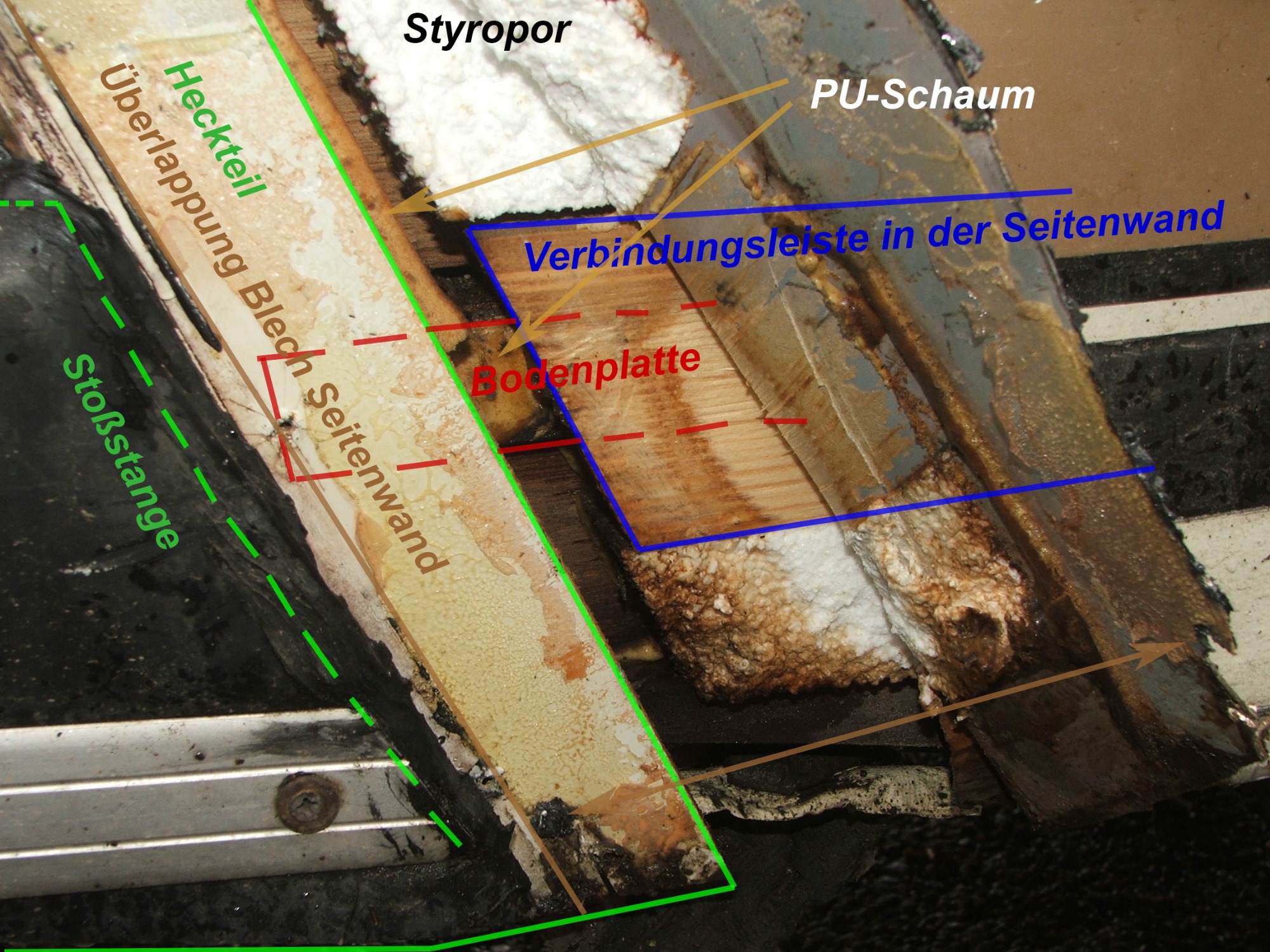 Ich habe das Sperrholz, das nicht mehr zu retten war, entfernt und mit der Vibrationssäge den noch am Sperrholz klebenden Schaumstoff abgekratzt.